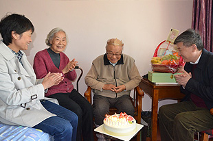 2019年4月14日农历三月初十,是学院吴鹤龄先生的90岁生日。上午时分,学院陈建国、滕俊琳、张博、许海芬、刘超五位老师与学生志愿者程乃嘉、杜郑威两位同学一道,共同代表生命科学学院校友尊师基金广大捐赠人,来到吴先生居住的海淀区上庄镇为其庆生。